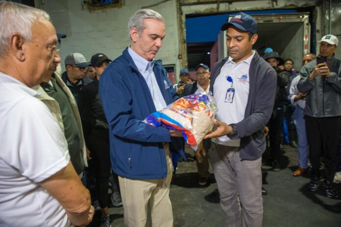 Durante su visita, el mandatario constató el proceso de selección y empaque de productos básicos como arroz, sal, aceite, azúcar, leche, habichuelas, sardinas, coditos, avena y café, que serán distribuidos a las familias damnificadas.