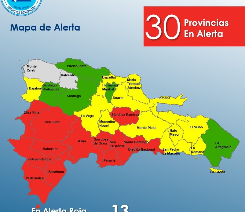 En alerta roja se encuentran: San Cristóbal, Peravia, San José de Ocoa, Azua, Barahona, Pedernales, Independencia, Bahoruco, San Juan, Elías Piña y Sánchez Ramírez, Santo Domingo y Sánchez Ramírez y el Distrito Nacional.