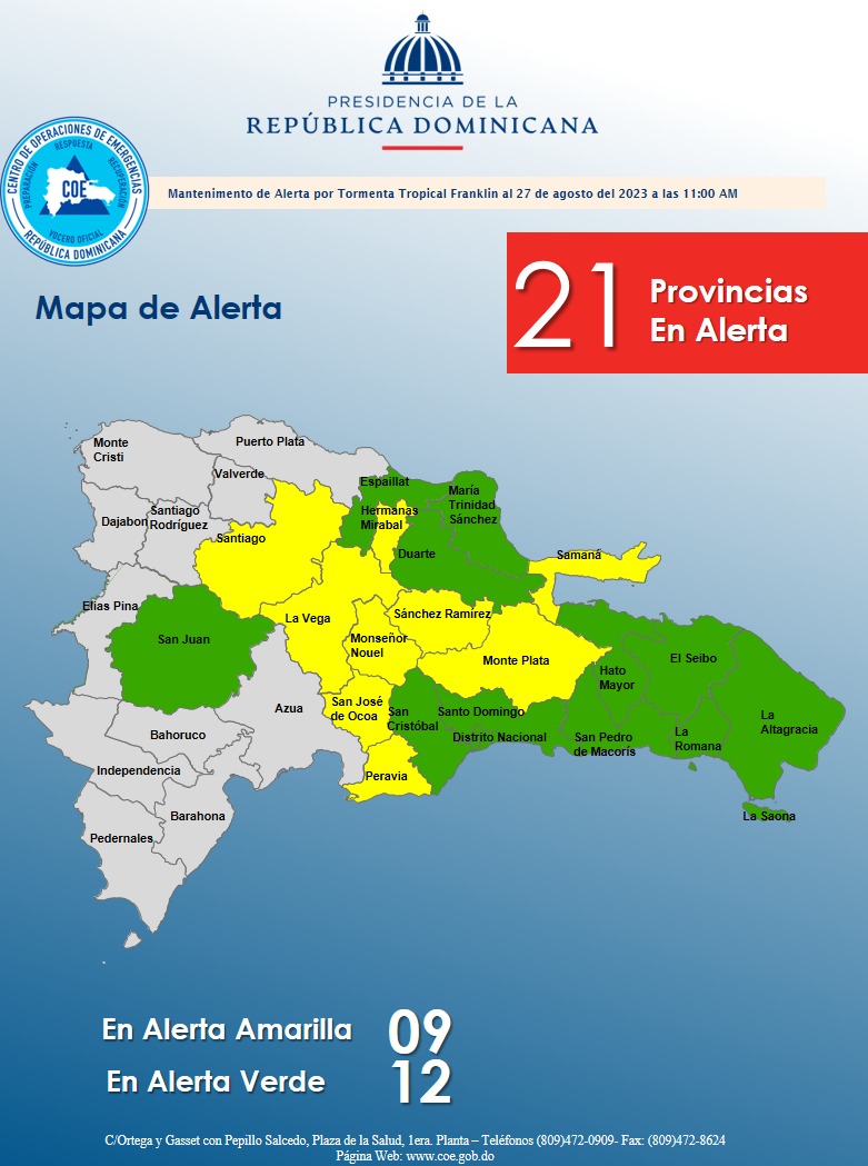 Según el informe número 10 del COE, permanecen en alerta amarilla las provincias: Monseñor Nouel, Sánchez Ramírez, Monte Plata, Santiago, Samaná, La Vega, San José de Ocoa, Peravia y Hermanas Mirabal. Mientras que, en alerta verde se encuentra Espaillat, La Romana, San Cristóbal, San Juan, El Seibo, Hato Mayor, el Distrito Nacional, Provincia Santo Domingo, María Trinidad Sánchez, Duarte, San Pedro de Macorís y La Altagracia.