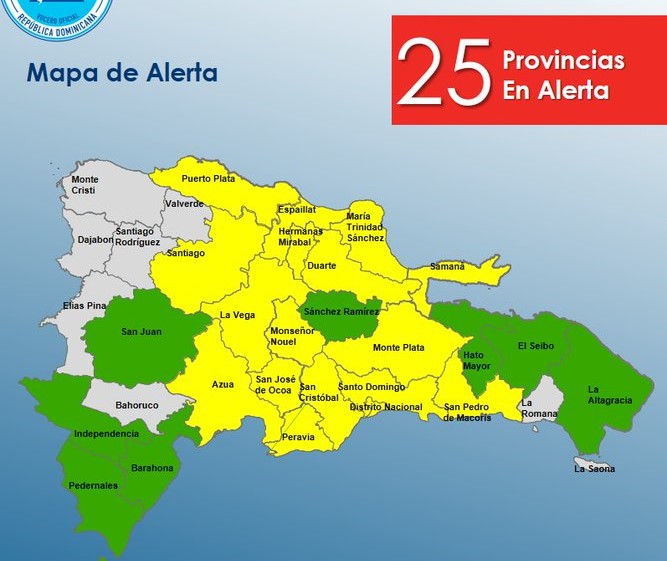 En alerta amarilla están: María Trinidad Sánchez, Puerto Plata, San José de Ocoa, Hermanas Mirabal, Monseñor Nouel, San Pedro de Macorís, Santiago, Santo Domingo, San Cristóbal, La Vega, Monte Plata, Azua, Duarte, Espaillat, Samaná, Distrito Nacional y Peravia.