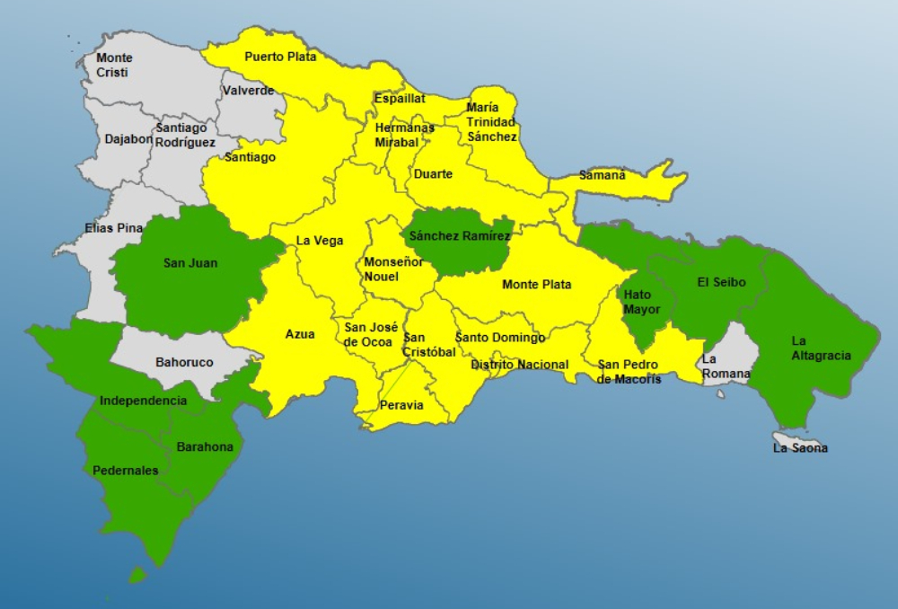 Santo Domingo .El Centro de Operaciones de Emergencia (COE) modifica la alerta roja por lluvias en el Gran Santo Domingo y en las provincias de San Cristóbal y Peravia. Las tres zonas pasan a una lista de 17 provincias en Alerta Amarilla que, junto a ocho provincias en Alerta Verde, completan el informe del organismo este miércoles.