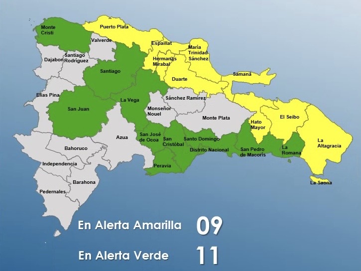 Indicó que en alerta verde están Santo Domingo, Distrito Nacional, La Vega, San Cristóbal, La Romana, San Juan, Monte Cristi, y Santiago. Por esto, el COE mantuvo a Puerto Plata, María Trinidad Sánchez, Espaillat, Hato Mayor, El Seibo, Samaná, Duarte, Hermanas Mirabal bajo alerta amarilla.