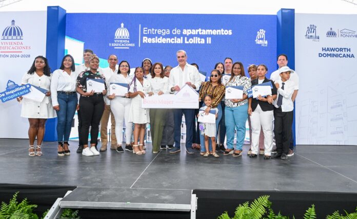 Santo Domingo. En un acto encabezado por el presidente de la República, Luis Abinader; la ministra de la Mujer, Mayra Jiménez; y el ministro de Viviendas y Edificaciones, Carlos Bonilla, el Ministerio de la Mujer entregó RD$ 6,940,000.00 millones de pesos en Bono Mujer, en el marco del Plan Nacional de Viviendas Familia Feliz, en el proyecto Residencial Lolita II, en Hato Nuevo de Manoguayabo, en Santo Domingo Oeste.