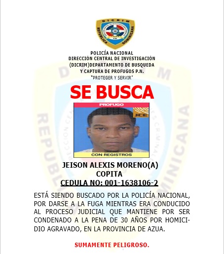 Azua. La Policía Nacional, a través de la Dirección Central de Investigación (DICRIM), informó que mantiene activa la búsqueda de Jeison Alexis Moreno, alias “Copita”, de 42 años, quien se fugó mientras era conducido a cumplir el proceso judicial correspondiente, tras ser condenado a 30 años de prisión por homicidio agravado.